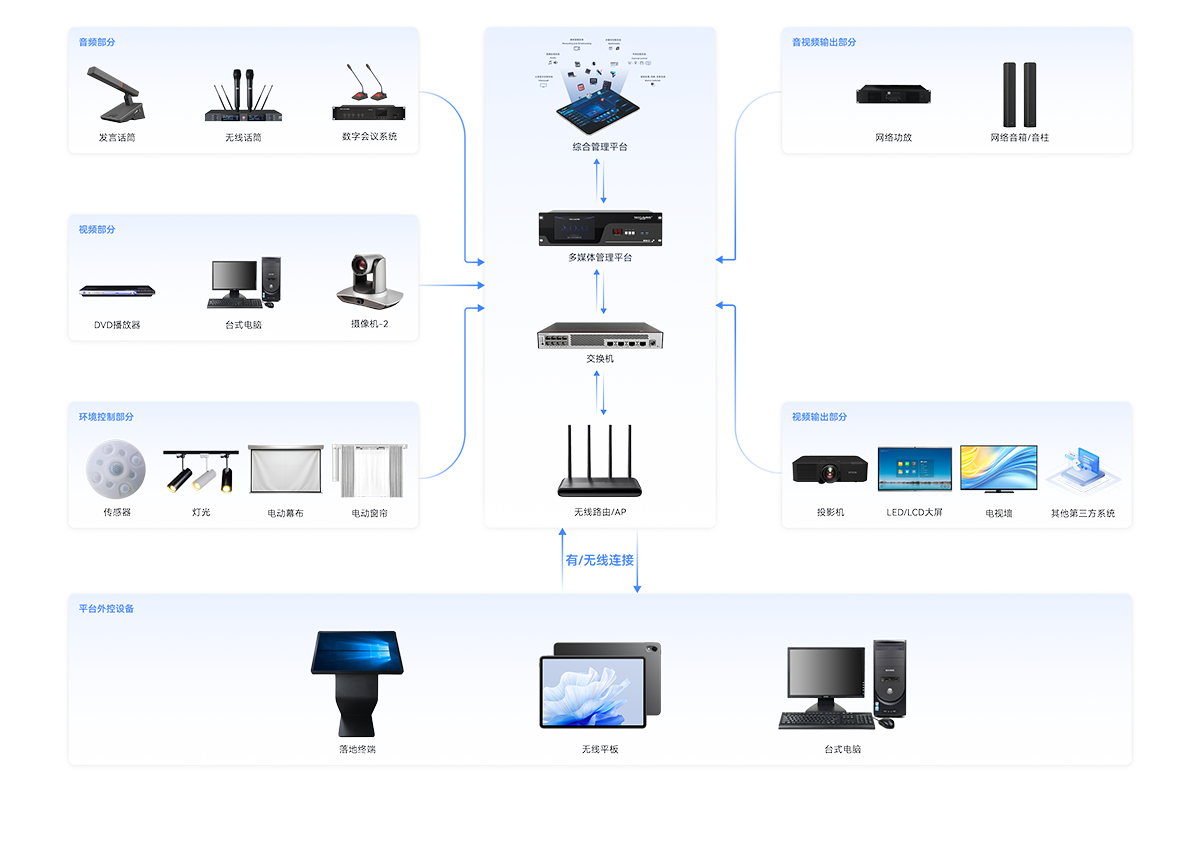 平台具备视频管理功能,通过PC/平板控制终端,实 现对视频输入/输出信号源的任意切换,同步传输,统一控制。