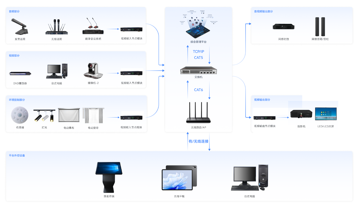 分布式管理平台是针对智慧办公及智慧会议领域开发的,是IT技术与AV的创新性物联网产物,平台基于B/S网络架构运行的信息化交互平台,通过各输入输出模块组成,采用Linux操作系统,将原来孤立的多方信息(音、视、控、录)全部互联互通,达到视听无界、信息交互、大数据管理、多方资源整合的可视化信息网络交互平台。
