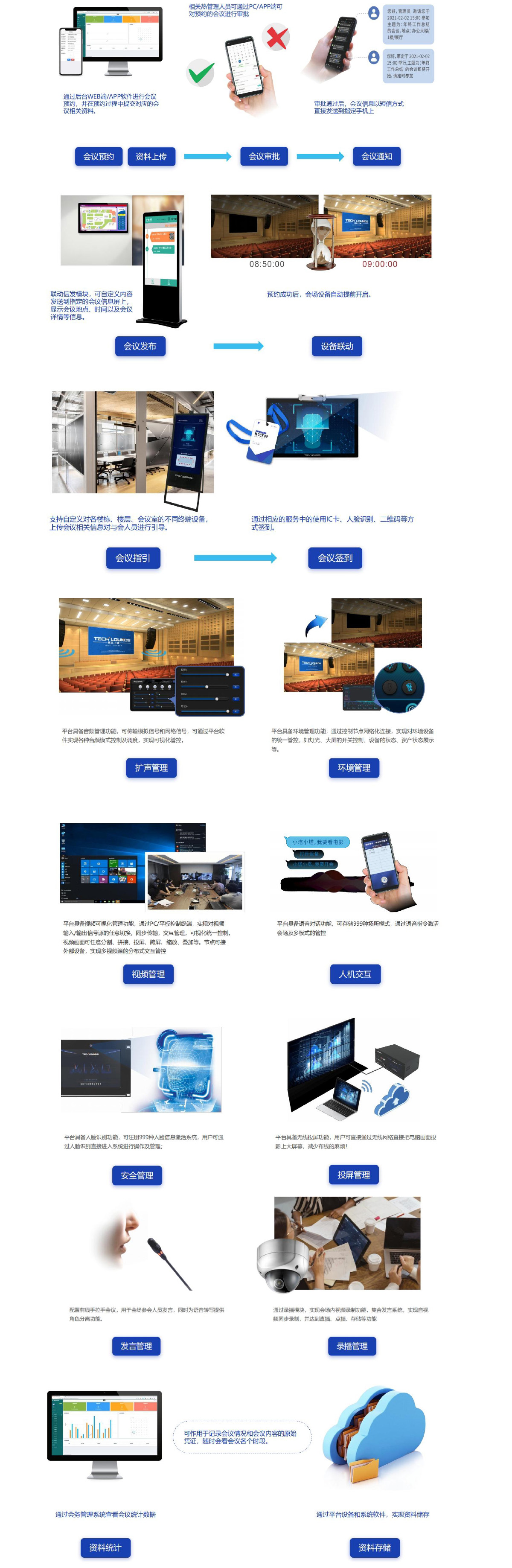 无纸化智慧会议平台是针对智慧办公及智慧会议领域开发的,是IT技术与AV的创新性物联网产物,平台基于Linux 操作系统运行,平台可将音频、视频、环境、数字会议、录播、无纸化、预约发布、灯光控制以及用户所需要的其他功能性需求设备实现模块化、平台化、可视化管理,平台兼容各种网络通讯协议:AE67、dante、H.264、H.265、TCP/IP等,可接入生态的各种音频、视频、环境、数字会议、录播、无纸化、预约发布设备。自动化的OA办公流程管理更加简单,可视化的数据展示最大程度减少人工成本,自动化的数据存储可支撑记录多种场景模式应用,AI智能化的运行可支持人机交互功能等。